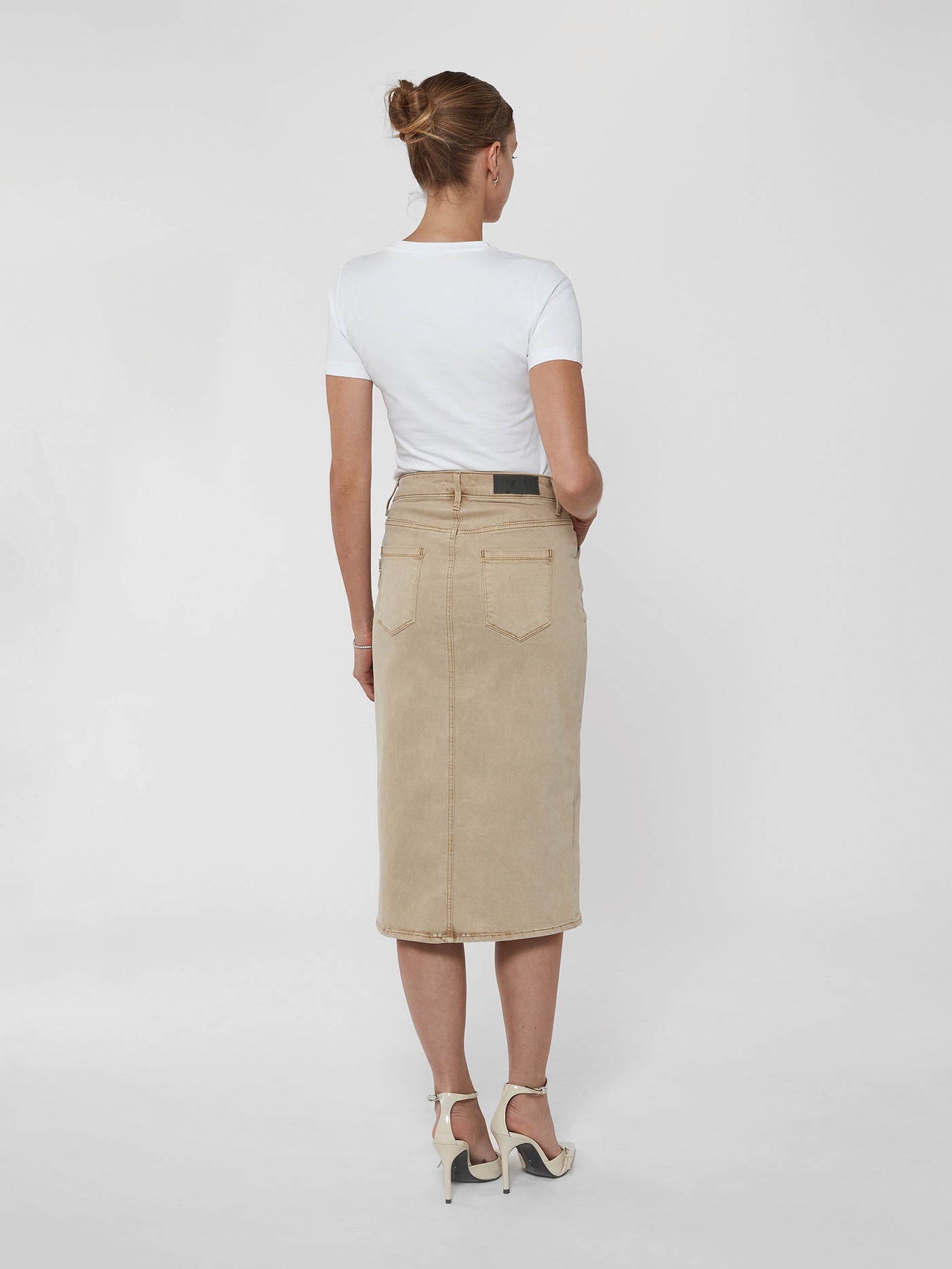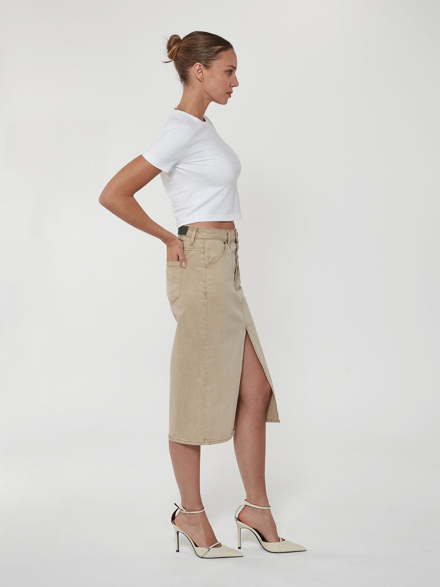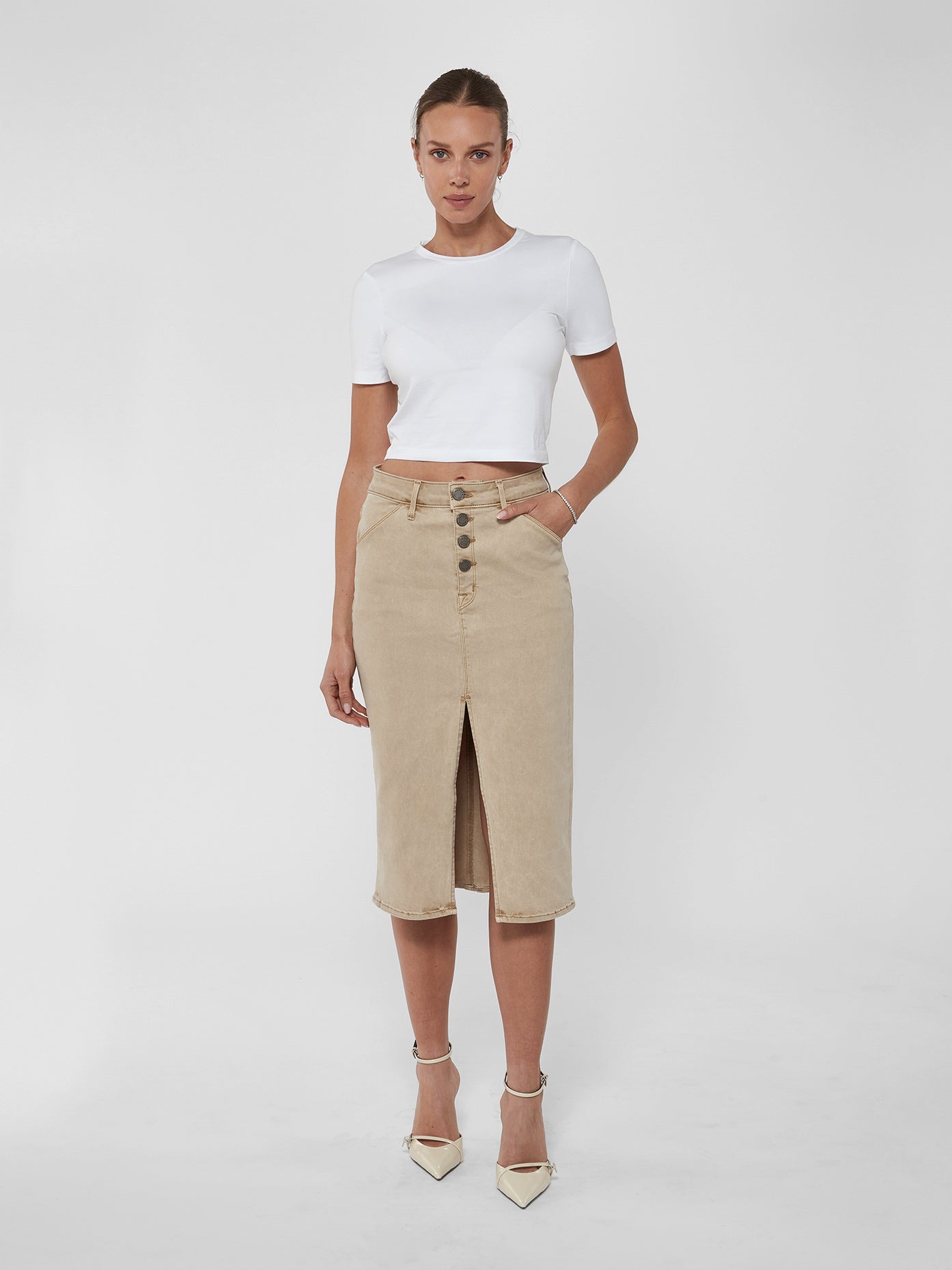 Button Fly Midi Skirt in Stone