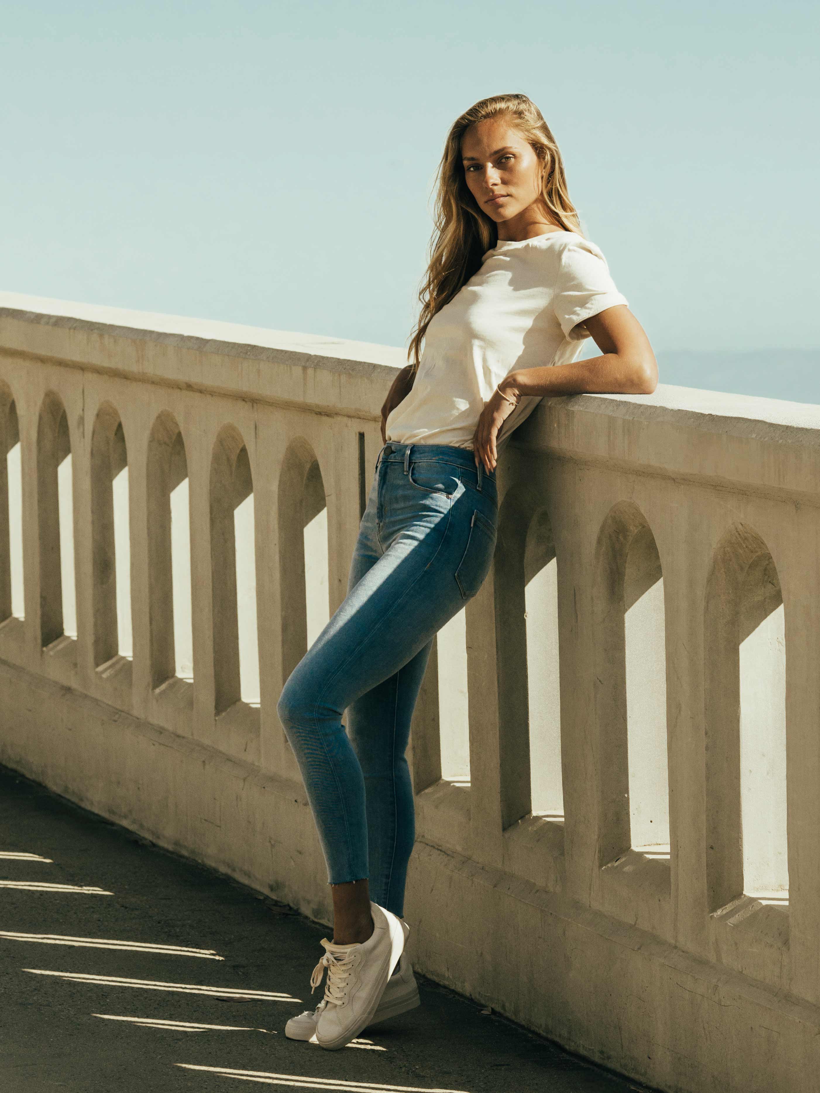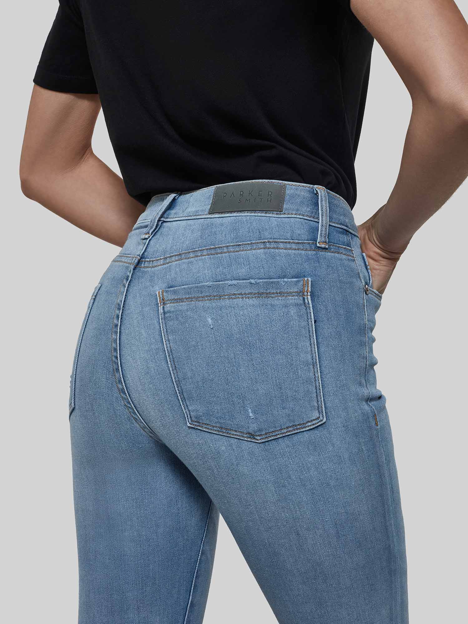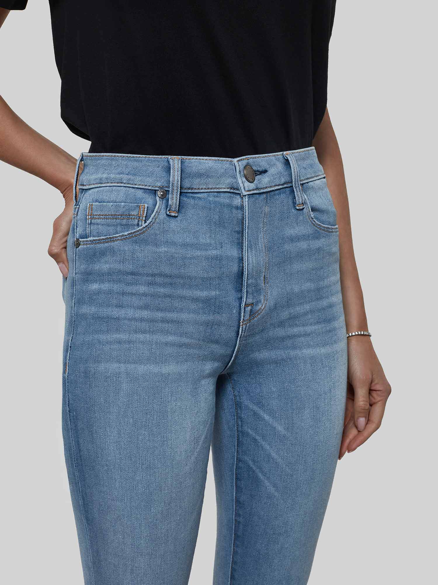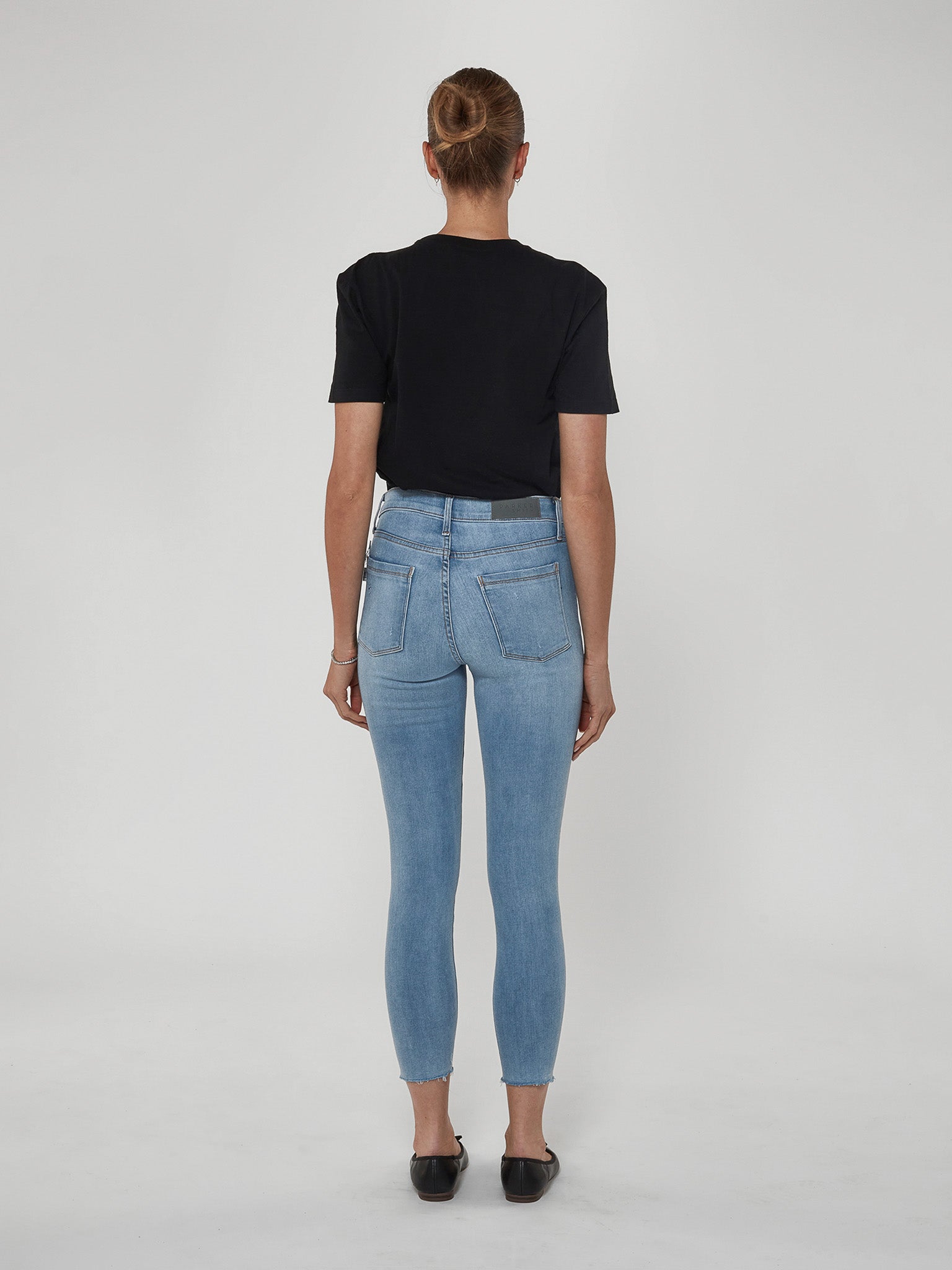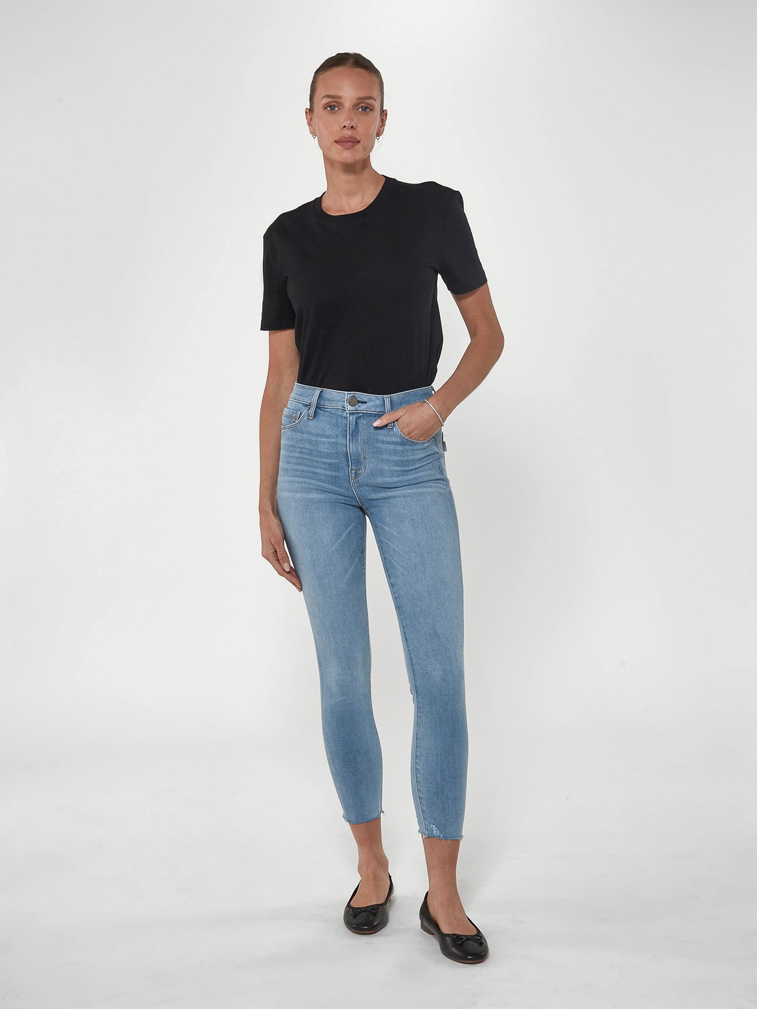 Our signature skinny is a flattering favorite, boasting a high-rise and classically elegant light blue denim with cropped raw hem finish. Hand-crafted in Los Angeles from our signature Japanese stretch denim, this best-selling silhouette fits like a glove, making it your go-to choice and a popular wardrobe staple.