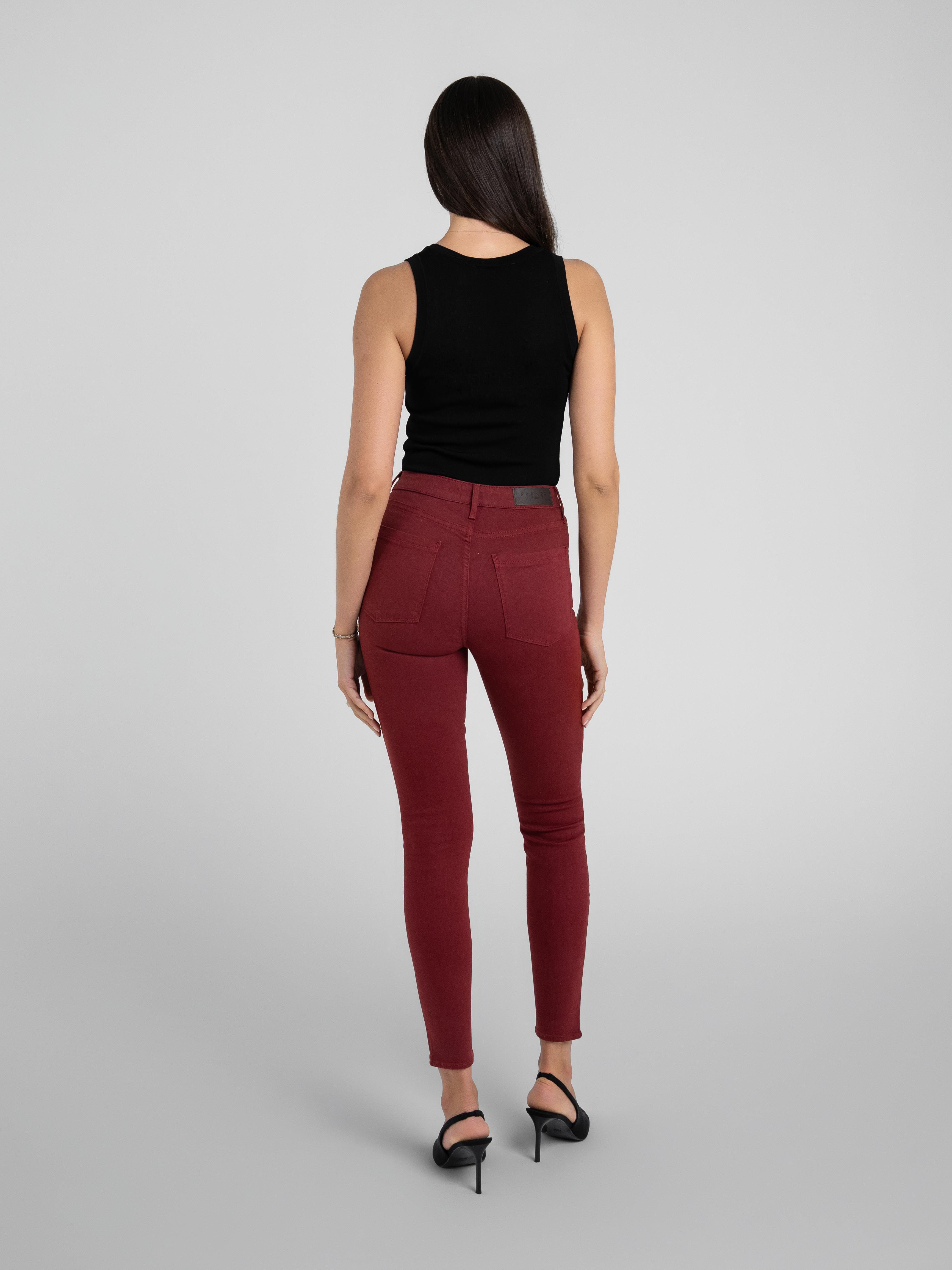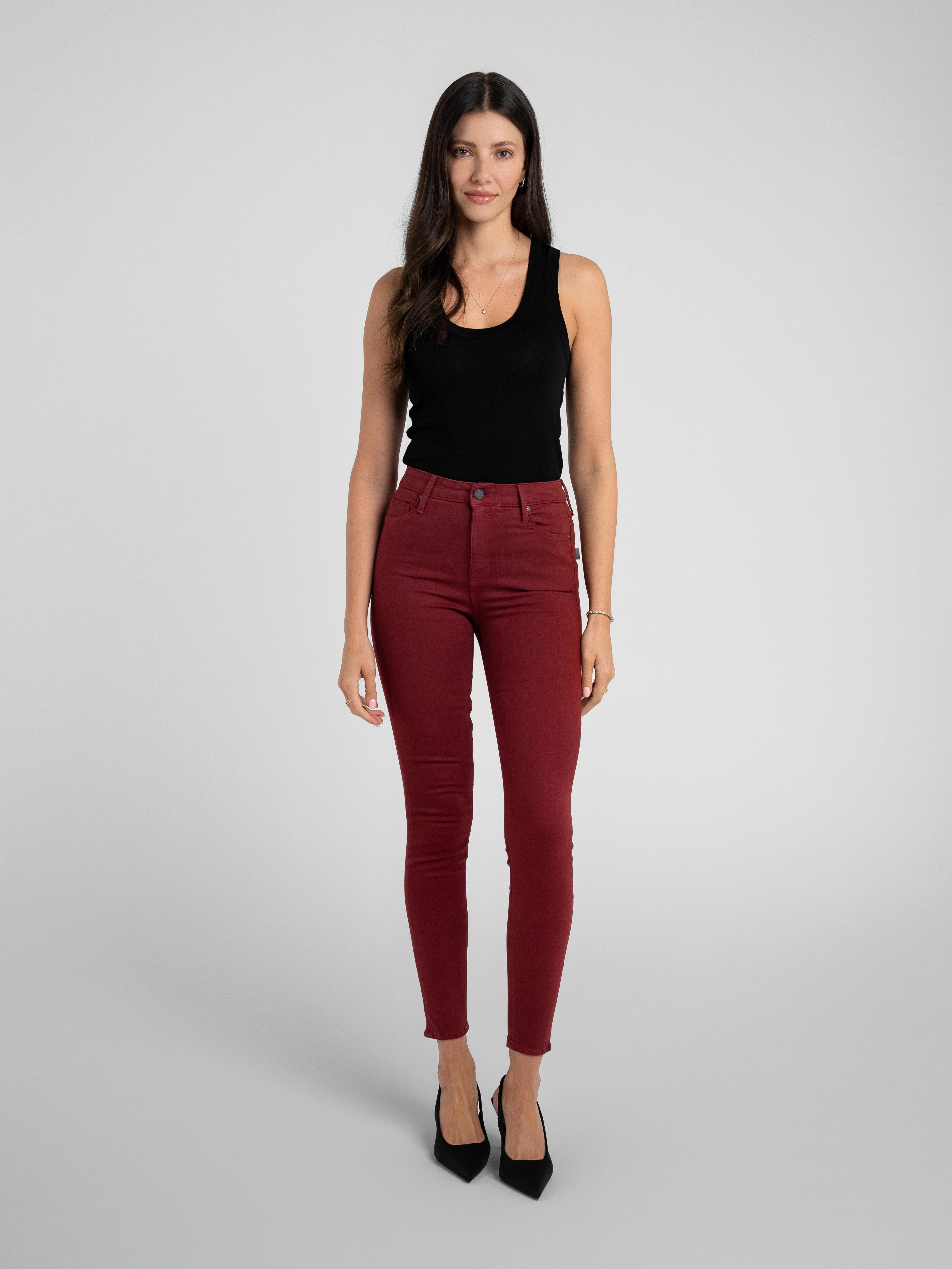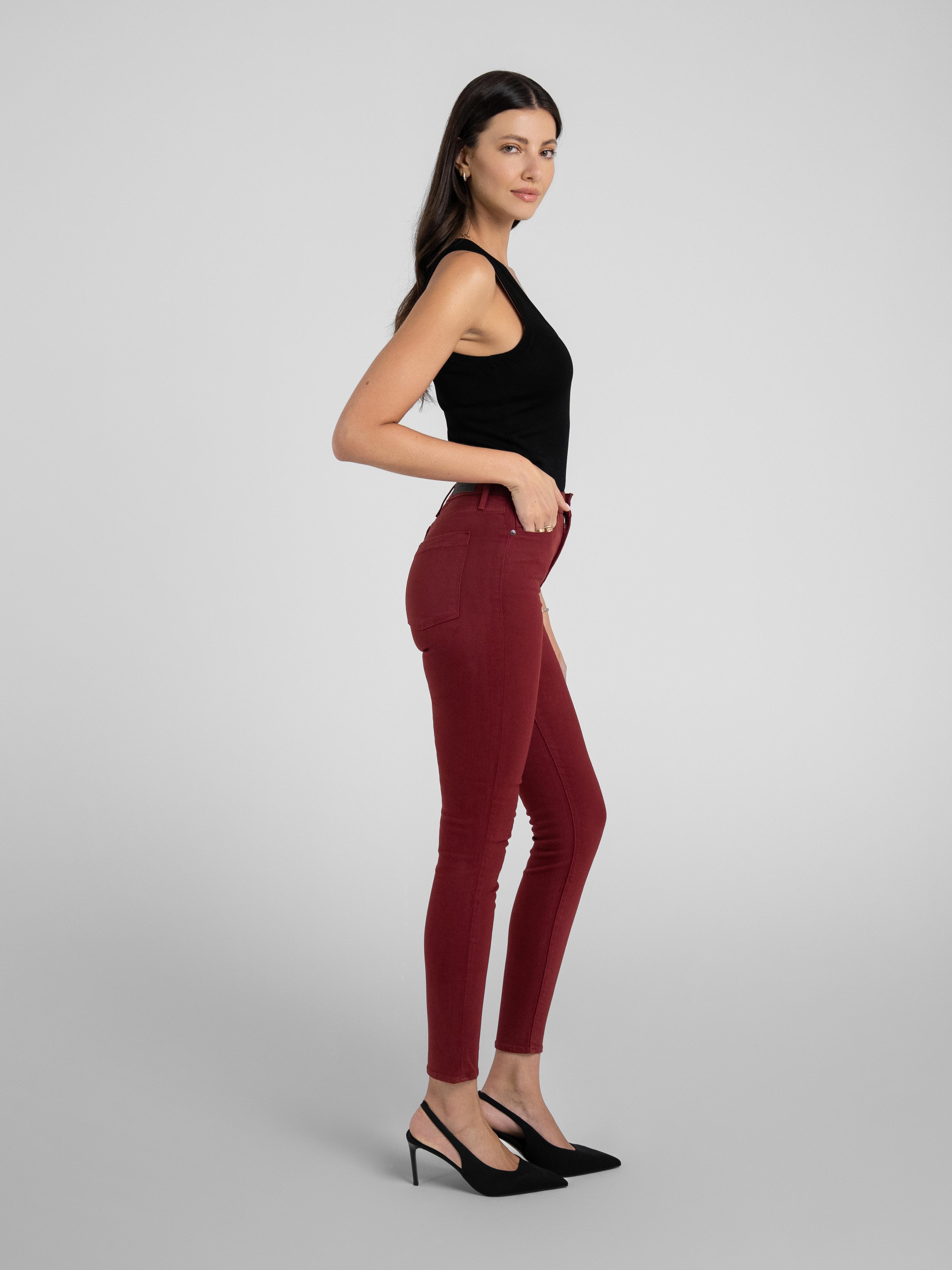 Meet our classic skinny jeans in Merlot featuring a high-rise that shapes your figure for a flattering and sculpted fit. Made in LA from an eco-friendly Japanese blend twill that provides comfort and style for any occasion.