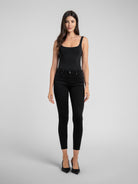 Ultra flattering and buttery soft, the skinny jean in Eternal Black will maintain its jet black color wash after wash. Fade resistant, this innovative European fabric holds its shape wear after wear. Made in Los Angeles with its popular mid-rise fit, this figure-flattering and leg-elongating silhouette contours perfectly to your body.
