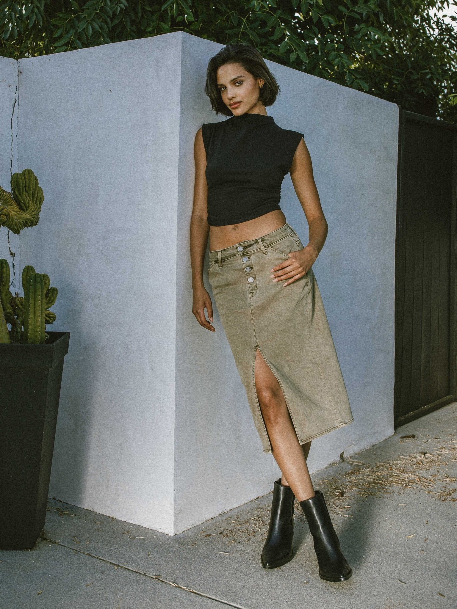 Our buttoned midi-length skirt features a high rise, exposed signature buttons, and an elegant front split. Made in LA from eco-friendly Japanese twill, it offers comfort and style for any occasion. Size up for a slouchy, low-rise fit!