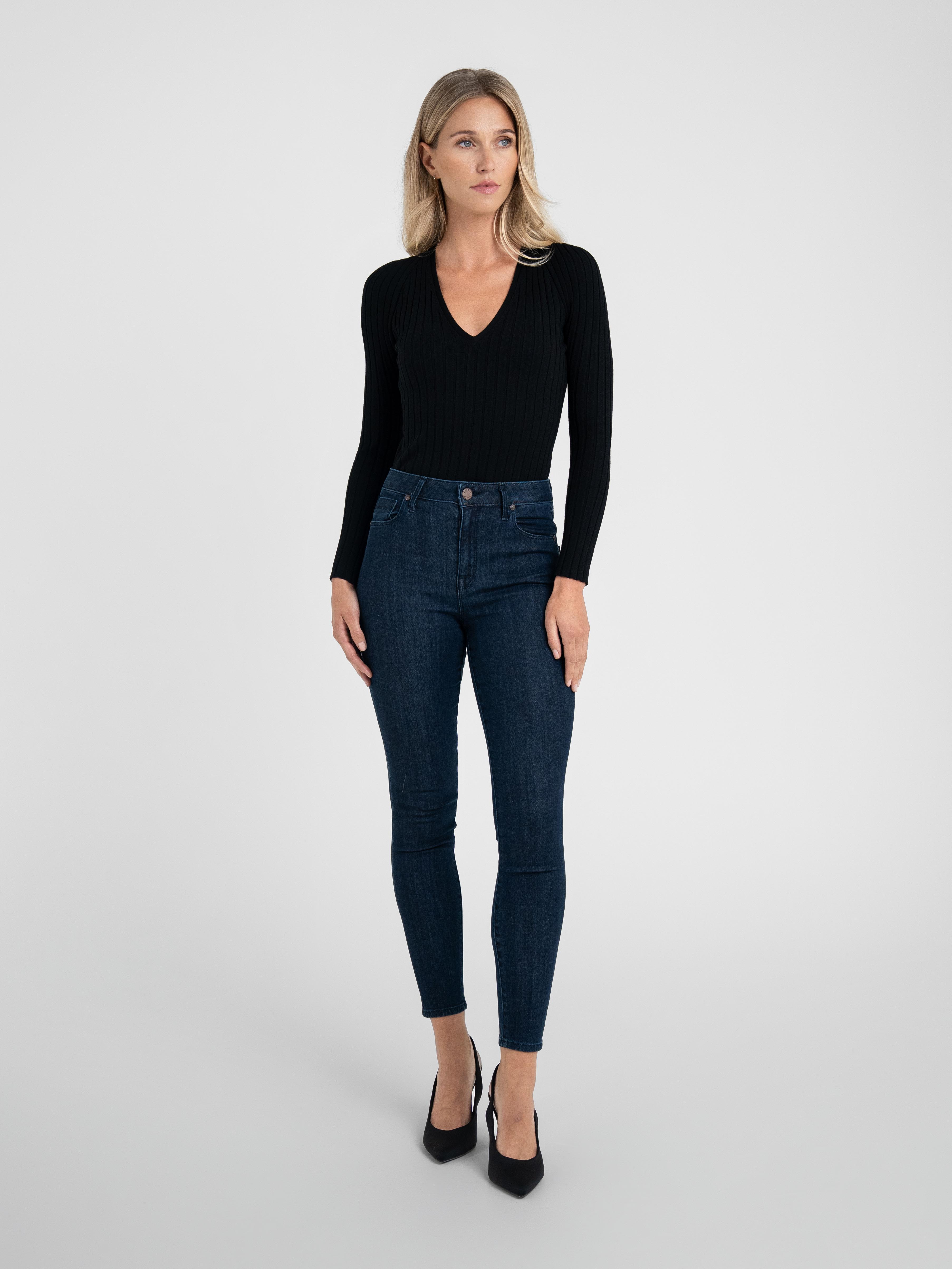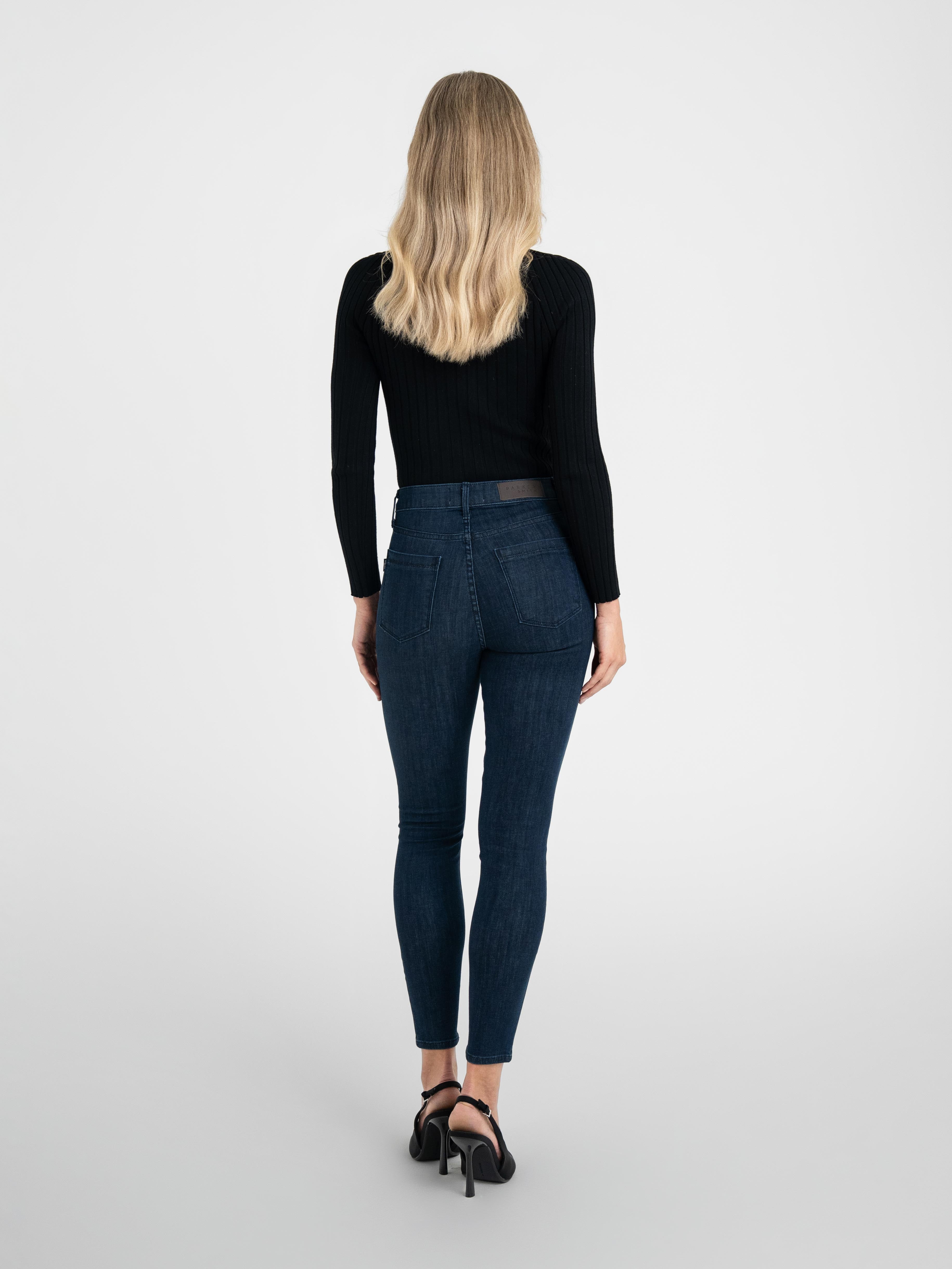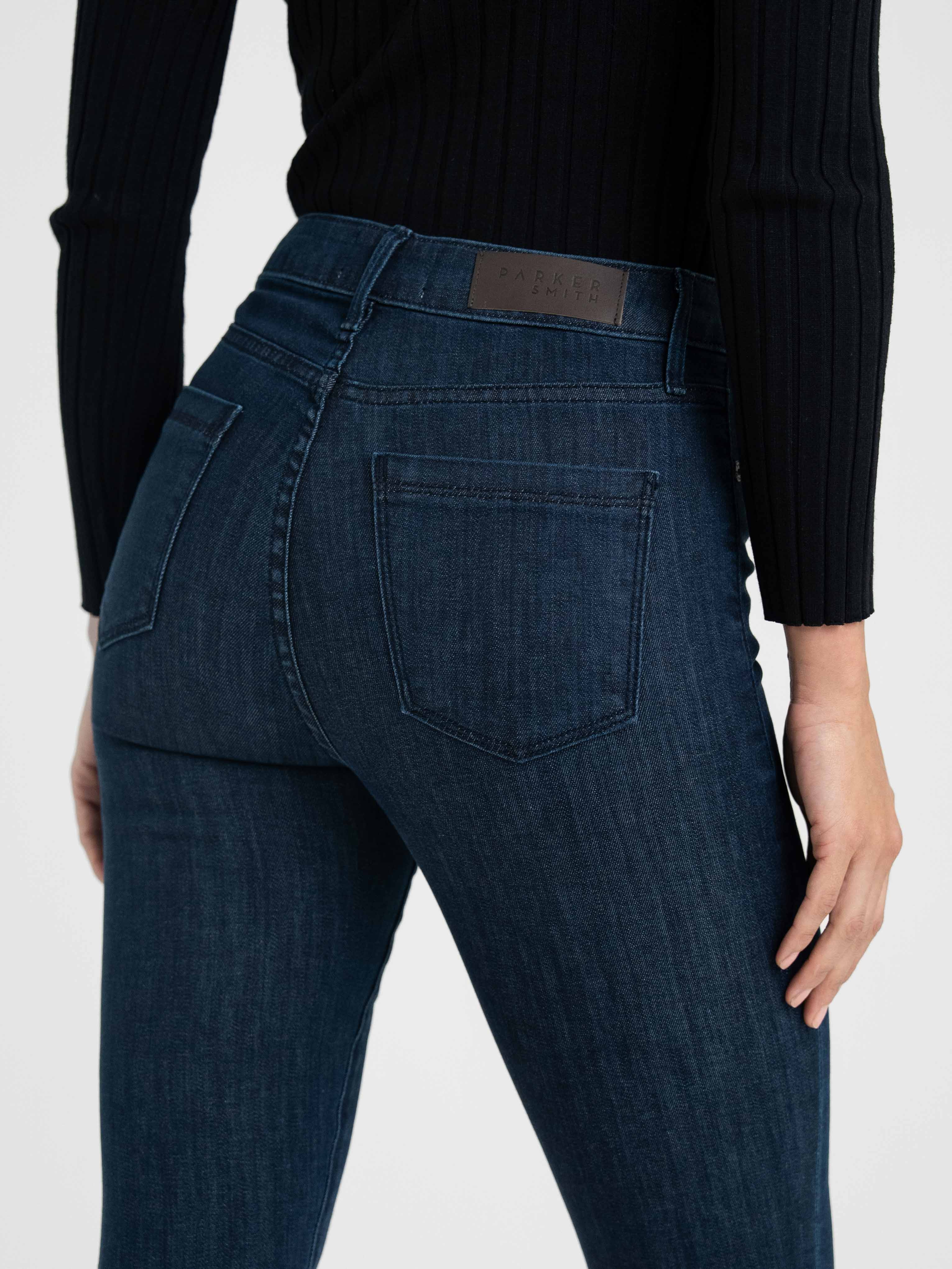 A versatile and flattering favorite, boasting a figure-sculpting ultra-high rise and a rich, dark blue wash. Hand-crafted in Los Angeles from our signature Japanease flex denim for supreme comfort, this best-selling silhouette fits like a glove, making it your go-to daily choice and a popular wardrobe staple.
