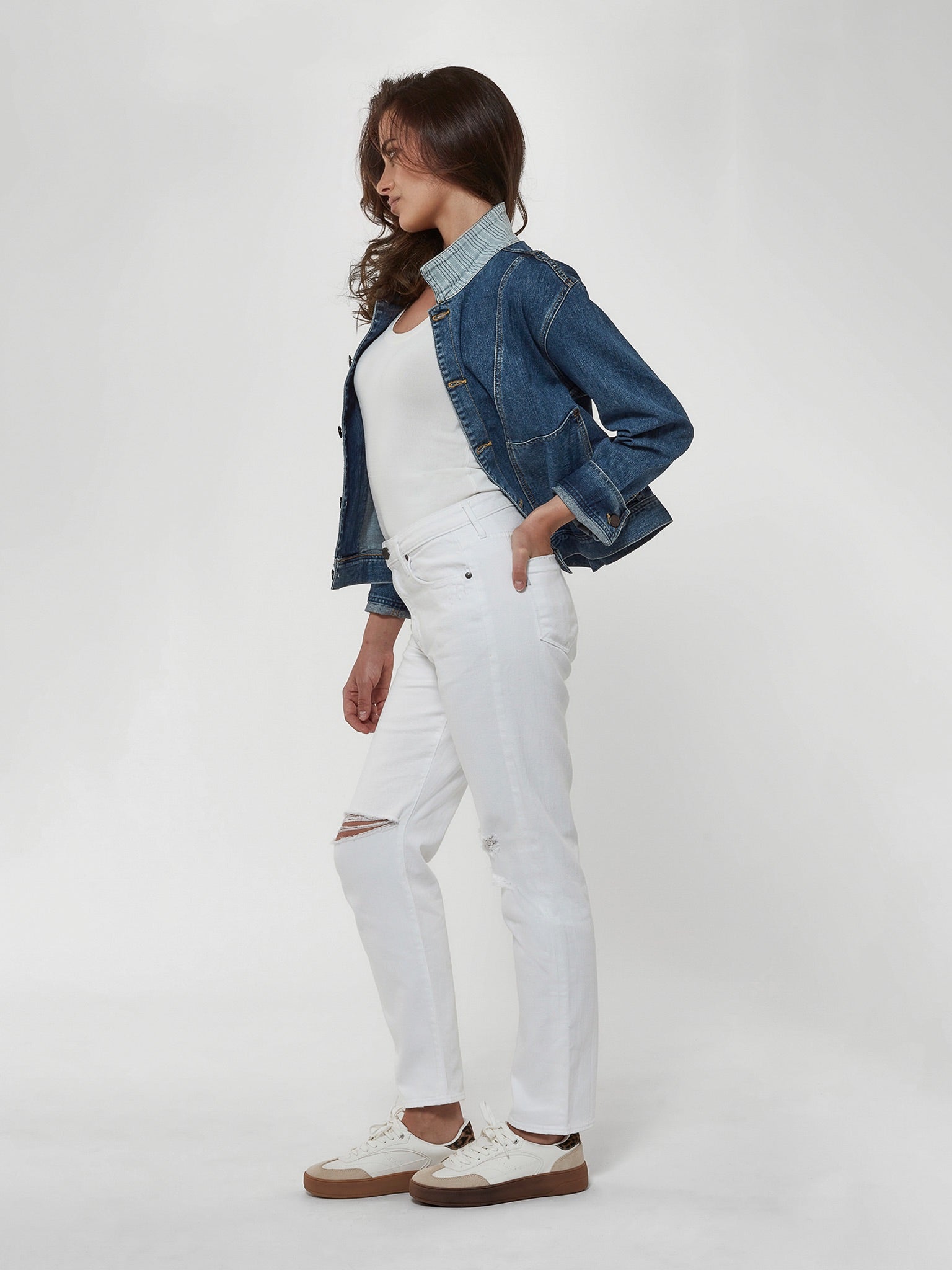 Relaxed and distressed in all the right places, our Boyfriend is effortlessly sexy, and cool. Lightly grazing the waist, this straight leg features a full length that just brushes the ankles.