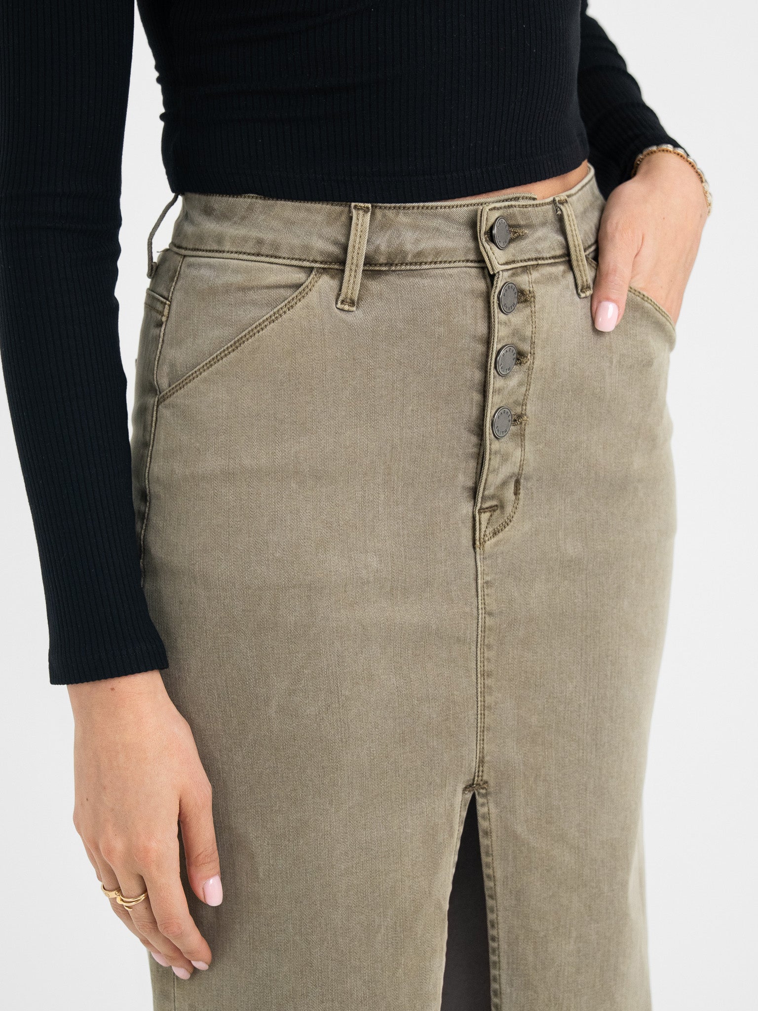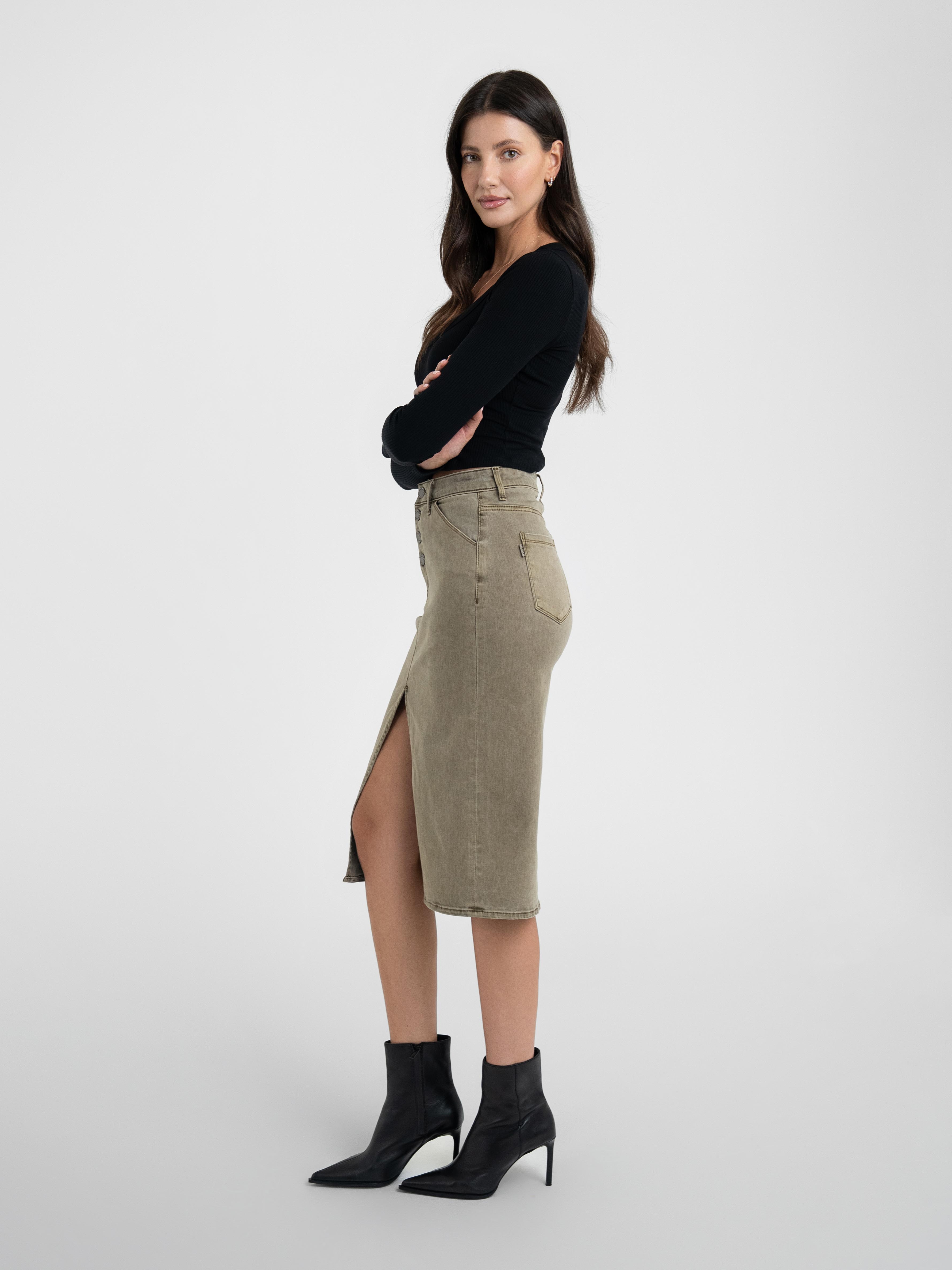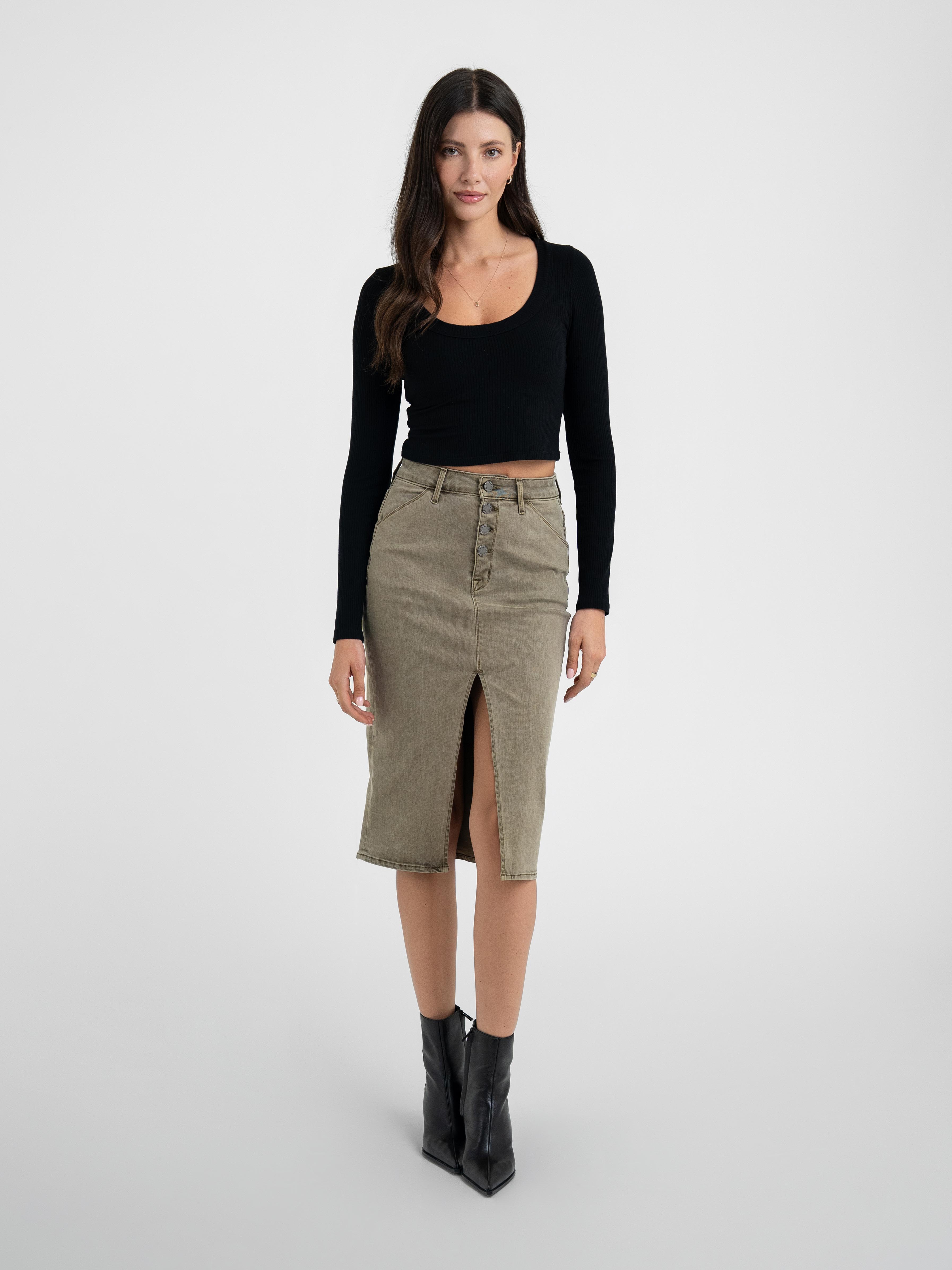 Button Fly Midi Skirt Army