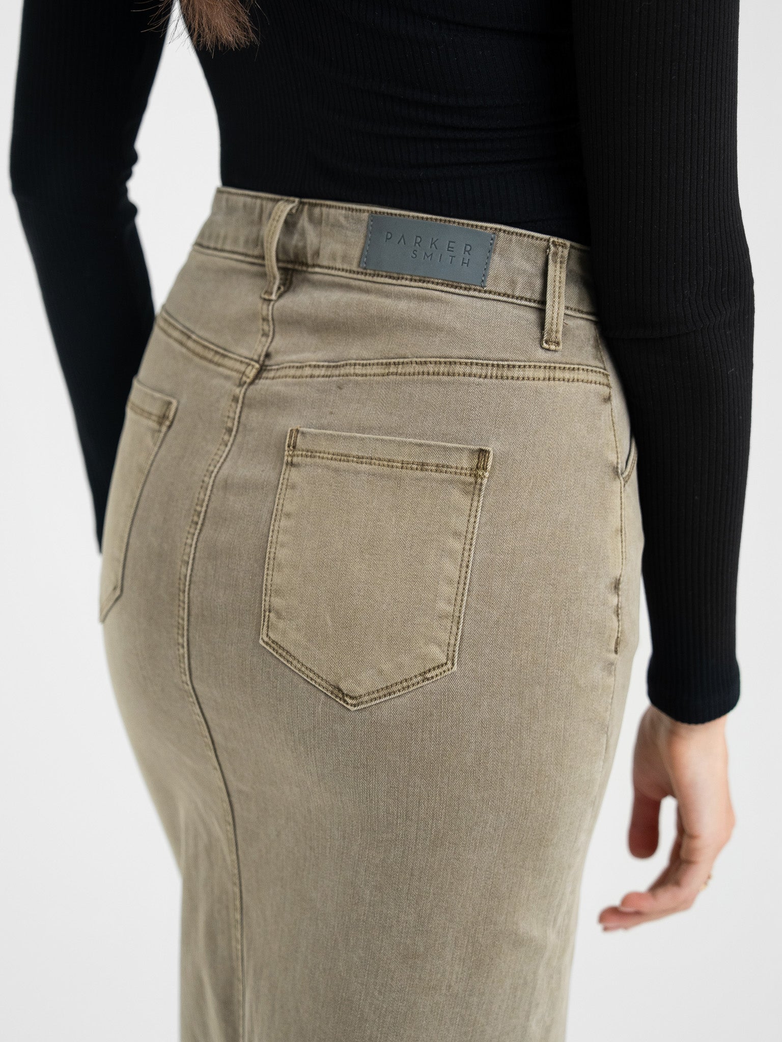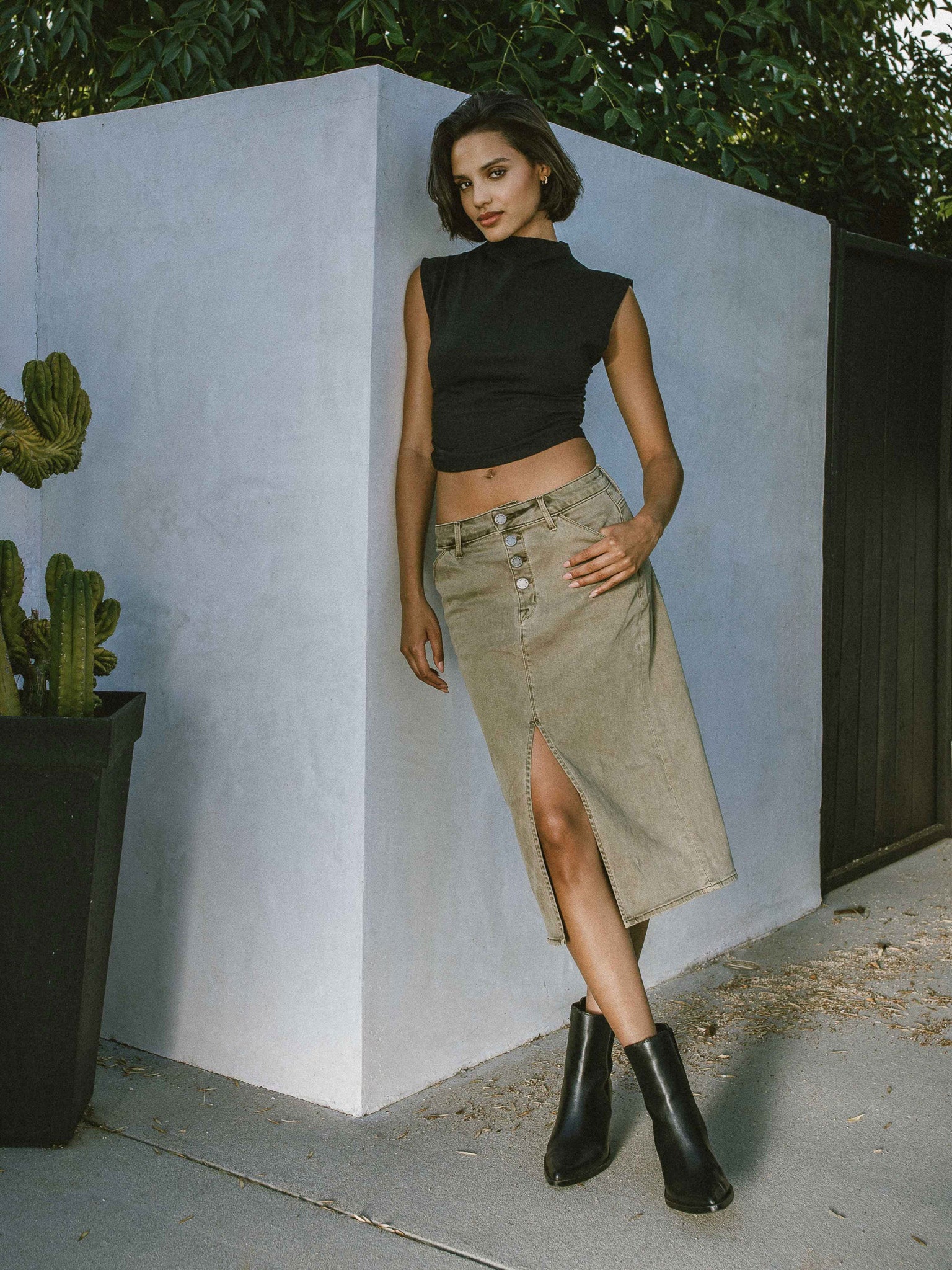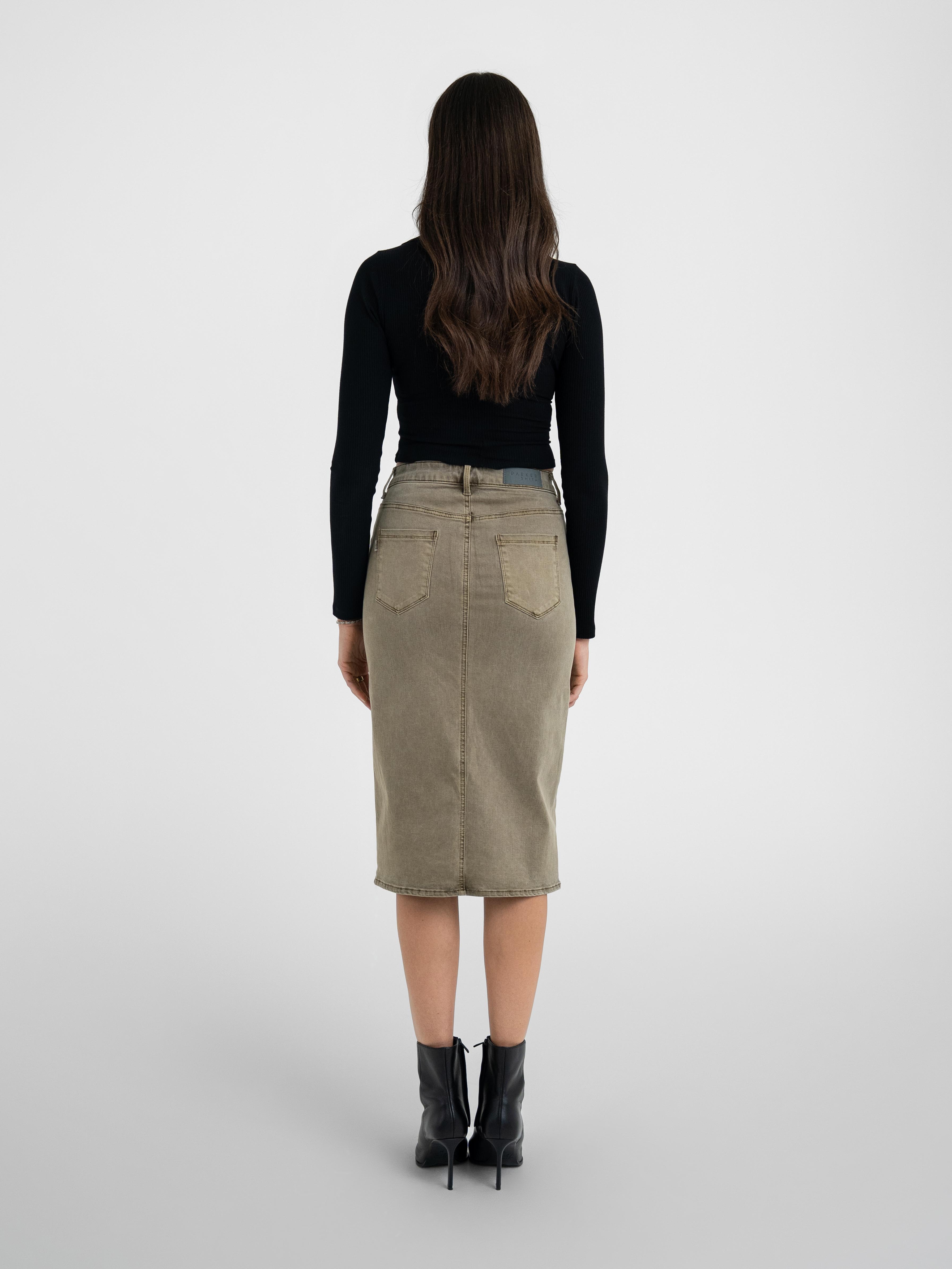 Introducing our new buttoned midi length skirt. Featuring a high rise, exposed PS signature buttons and a front split that is effortlessly elegant. Made in LA from an eco-friendly Japanese blend twill that provides comfort and style for any occasion.