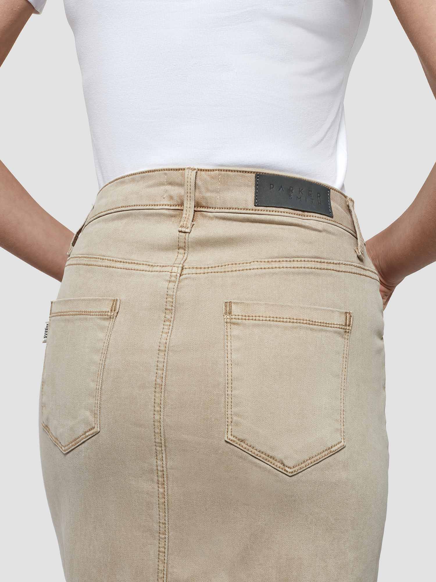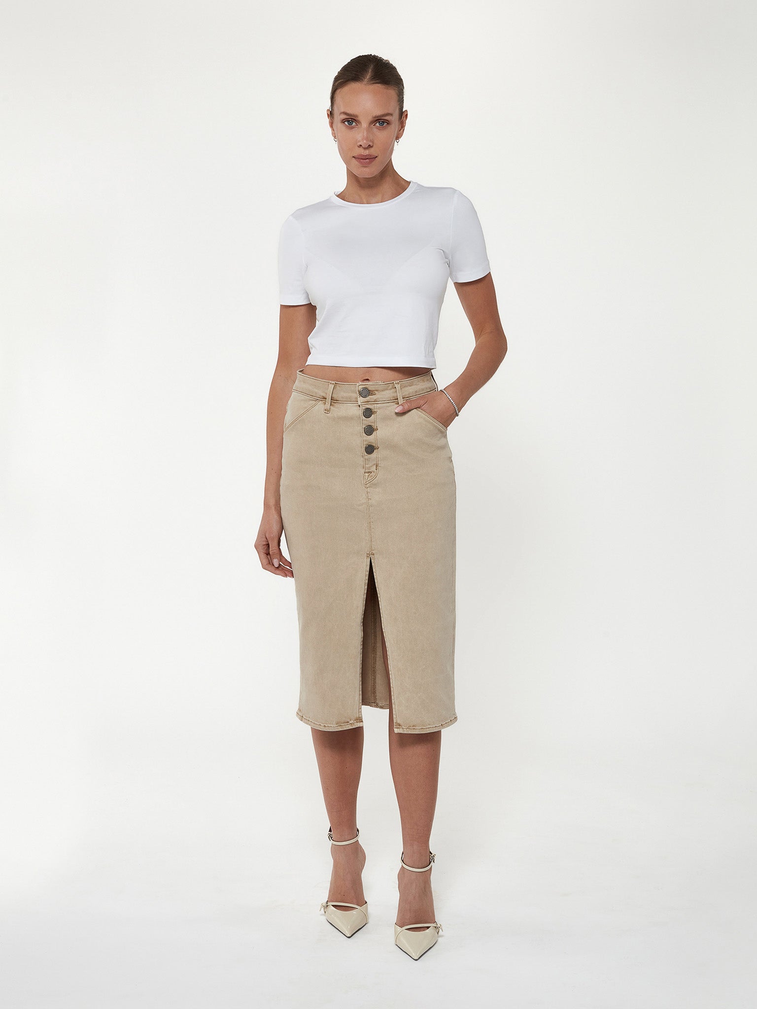 Introducing our new buttoned midi length skirt. Featuring a high rise, exposed PS signature buttons and a front split that is effortlessly elegant. Made in LA from an eco-friendly Japanese blend twill that provides comfort and style for any occasion.